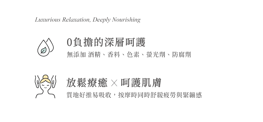 適合全身按摩與日常保養,同時舒緩疲勞、放鬆身心,打造柔嫩透亮的健康膚觸