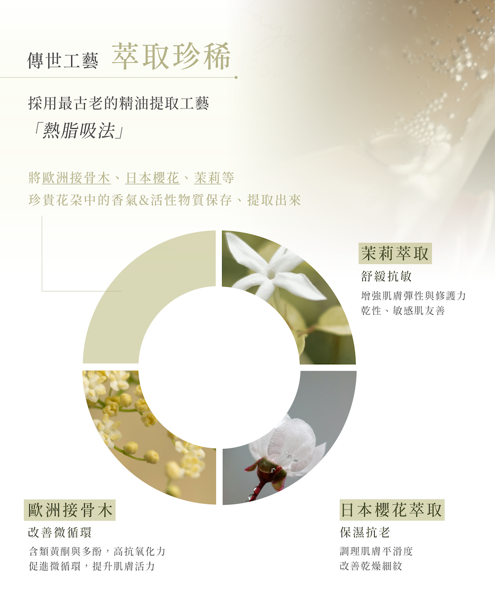 完整保留歐洲接骨木、日本櫻花與茉莉花中的香氣與活性成分,為肌膚注入深層修護能量