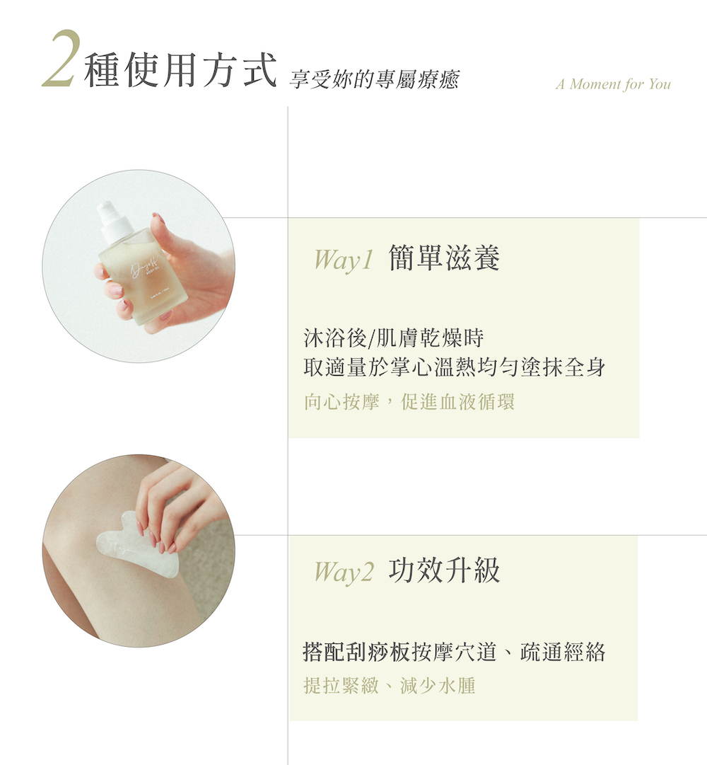 沐浴後或肌膚乾燥時,取適量於掌心塗抹全身並輕柔按摩,促進血液循環與肌膚滋養