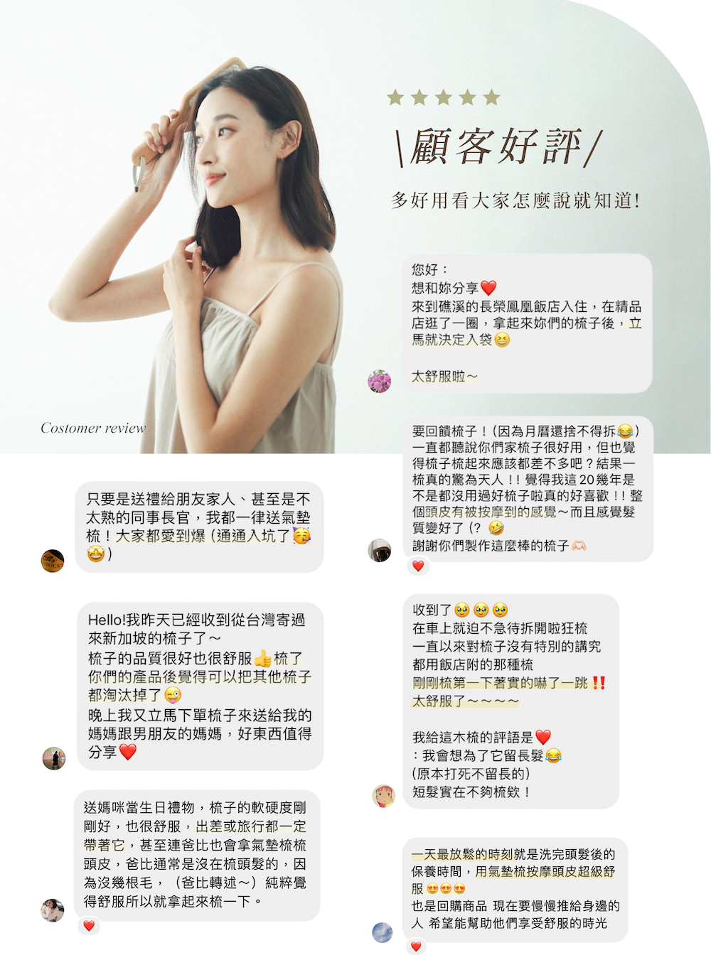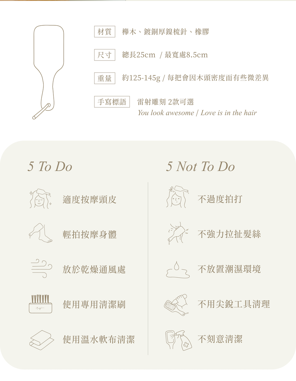 1. 梳柄為 天然櫸木 製成,無多餘染色加工,以木頭自然紋理呈現,每一把色澤皆有些微差異。