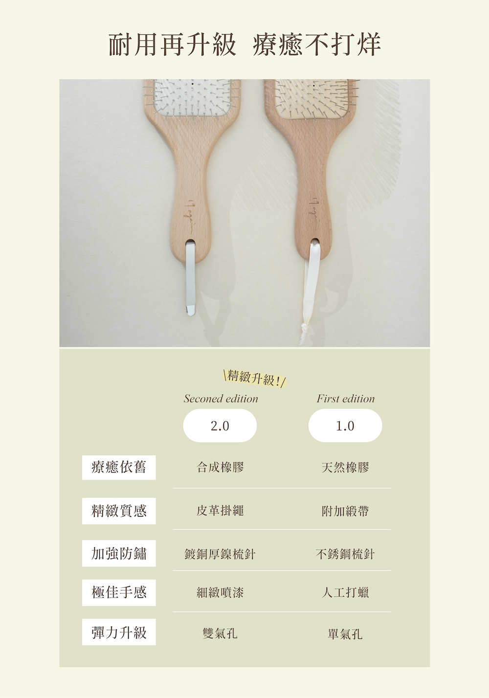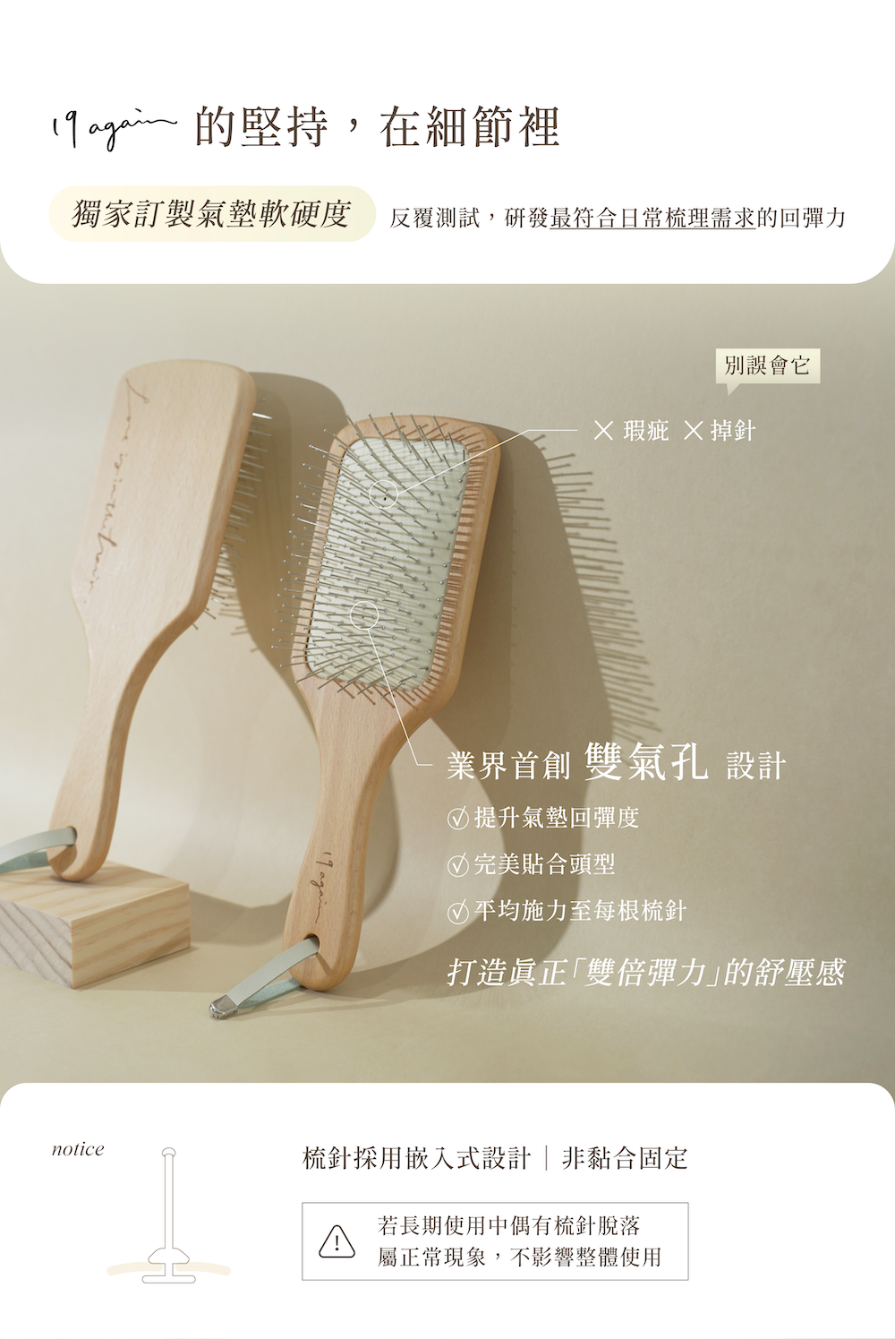 研發最符合日常梳理所需的彈性,橡膠排氣孔設計,能增加回彈效果