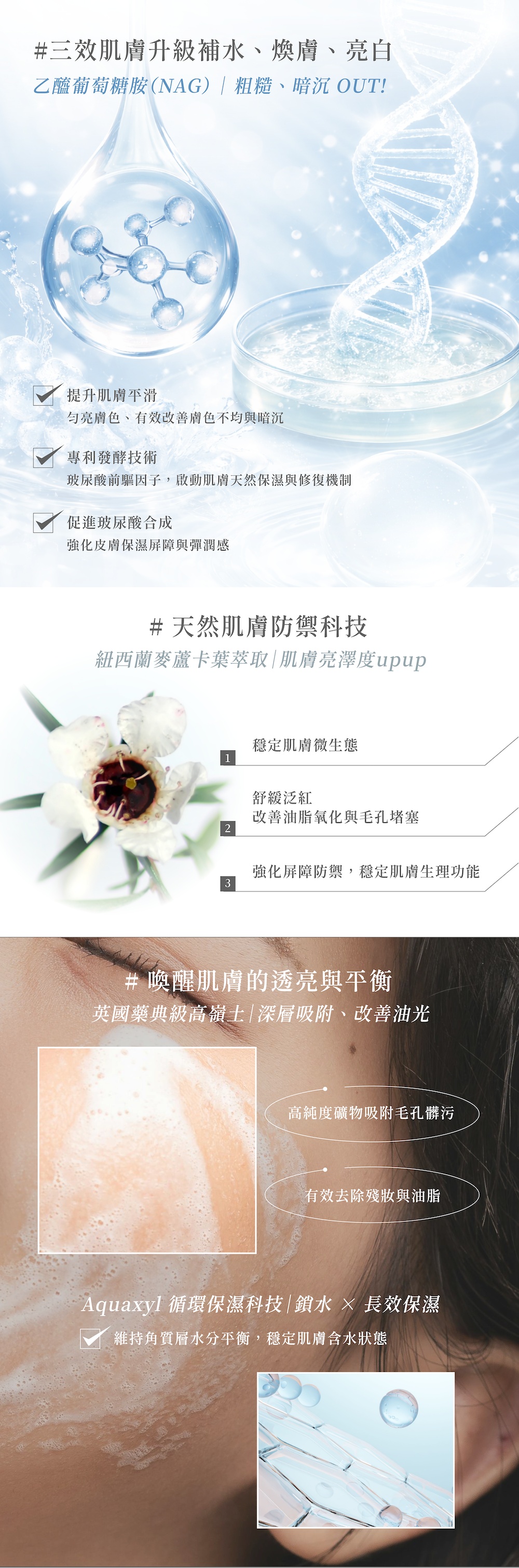 乙醯葡萄糖胺+紐西蘭麥蘆卡葉萃取,改善暗沉、吸附毛孔髒污、穩定肌膚屏障
